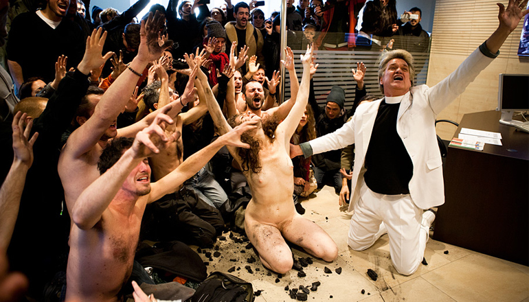 Voina is a street collective of actionist russian artists who engage in political protest art. Their political orientation is anarchy and their enemies are philistines, cops, and the regime. It's a militant gang, dominated by horizontal ties in everyday life and employing vertical relationships during actions. The group preaches renunciation of money and disregard towards the law (“the no-whoring way”). Founded by Vor and Kozlenok in October 2005, the group was named after Vor (“War”). Initially, Voina actions were clandestine and anonymous, and were called “training” or “practice”. Voina has enjoyed public recognition since 2008. To date, over 200 activists have participated in Voina actions. At least 20 criminal investigations into the group’s activities have been initiated, some of them still ongoing.