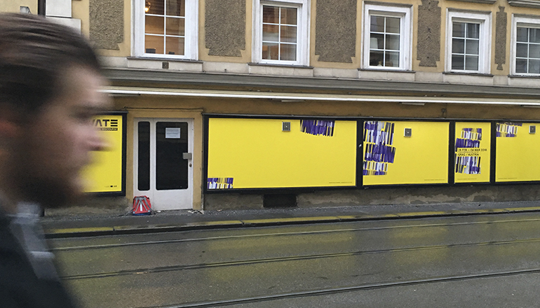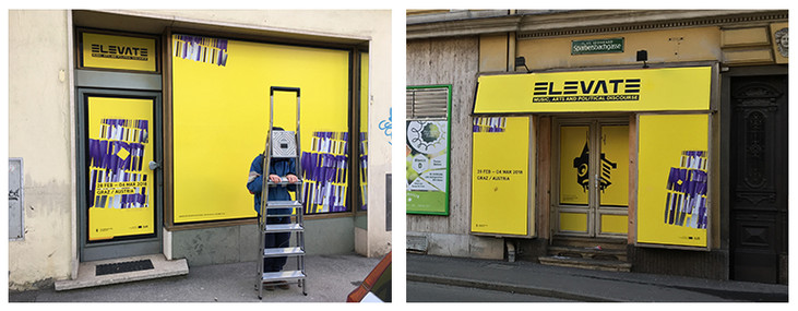 Die Gründerin der Raumbasis, Anna Resch, war bereits 2017 Teil einer Diskussionsrunde, die sich mit der Rolle der Kultur in der Stadt von Morgen beschäftigt hat. Auch heuer hat Resch ein Elevate-Projekt tatkräftig unterstützt. Gemeinsam mit dem Festivalteam und der Bildenden Künstlerin Mimu Merz konnten leerstehende Geschäftslokalen aufgespürt werden. Insgesamt fünf auf Graz verteilte Auslagen werden nun von 07.02. bis 07.03.2018 mit Grafiken der Künstlerin bespielt. Seit einigen Jahren ist Mimu Merz für die visuelle Gestaltung der Elevate-Festivalkommunikation zuständig. Sie entwirft dafür meist großformatige Grafiken, die als Basis für verschiedene Drucksorten die inhaltlichen Anliegen der jährlich wechselnden Schwerpunktthemen des Festivals transportiert. Als grafische Interventionen im öffentlichen Raum sind ihre Visualisierungen nun auch an Orten zu sehen, die sonst leerstehen würden. Wo oft nur noch abblätternder Putz oder mit Holzscheitern vernagelte Sperren an vormals einladende Schaufenster erinnern, weisen nun farbliche Marker auf das Potential von Zwischennutzung hin. In den kommenden Jahren plant Elevate vermehrt die Bespielung von Leerständen. Wenn es soweit ist, findet ihr hier alle relevanten Infos.