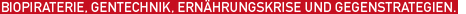 Die BUKO-Kampagne gegen Biopiraterie kritisiert den vorherrschenden Habitus, über biologische Vielfalt nur als Naturschutzthema zu reden. Damit werden andere Interessen verschleiert. Biodiversität ist eng verbunden mit politischen, sozialen und ökonomischen Komponenten, und um die “Eigentumsfrage” findet ein weltweiter Machtkampf statt. Transnationale Saatgut-, Pharma- und Kosmetikkonzerne des "Nordens" (oft im Verbund mit Forschungseinrichtungen) streben mit Hilfe von ständig schärferen und umfassenderen geistigen Eigentumsrechten nach mehr Nutzungskontrolle über die biologische Vielfalt. Im Visier haben sie die genetischen und biologischen Grundlagen und Eigenschaften aller Nutz- und Heilpflanzen. D.h., ihnen geht es letztlich um die Kontrolle über den gesamten Lebensmittel- und Pharma-Bereich weltweit.