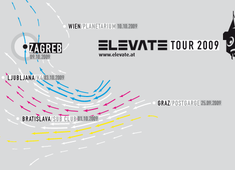 Elevate Tour je inicijativa istoimenog festivala kojom organizatori s jedne strane ?ele internacionalnoj publici predstaviti mlade artiste iz Austrije, te s druge strane upoznati lokalnu publiku sa programom festivala. Sa raznolikim programom koji uključuje preko 25 artista, Elevate će se predstaviti u pet gradova četiriju zemalja. Osim domaćih snaga koje čine cfsn DJs i Raveri, u Zagrebu će nastupiti i el rakkas, mladi dvojac čija se izdanja u zadnje vrijeme mno?e na labelovima poput LoDubs i Surface Tension, te izc, pokretač dubsquare labela, sve zapa?eniji producent i voditelj emisije na sub.fm-u. Vidimo se!