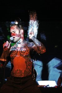 The eccentric duo, Didi Bruckmayr and Sigi Aigner, both known as singers of notorious performance-band Fuckhead, have been dedicating themselves to musical and visual experiments in clubs, white cubes and theatre venues since 2008. In "Interzone", "proband" Bruckmayr constructs an associative text using fragments from Burroughs’s same-named collection of short stories and notes, opening the door to the unconscious: a surreal monologue held in the weirdest voices, to the point of mental and physical exhaustion. "Sound machinist" Aigner stimulates the dreamlike condition of his colleague by means of abstract digital sounds and organic rhythms. Beware: deep bass lines, drones and frantic 3D objects for a happy audience.