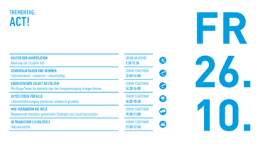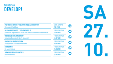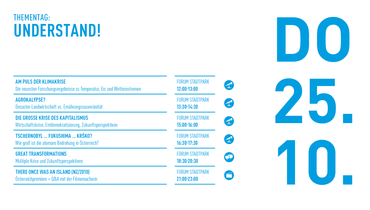Im Rahmen der drei Thementage „Understand!“, „Act!“ und „Develop!“ bietet das Diskursprogramm Analysen der aktuellen Entwicklungen durch renommierte Expert*innen (Understand!), präsentiert zukunftsweisende Alternativen, die zum Aktiv-Werden einladen (Act!), und versucht gemeinsam mit dem Publikum wichtige Grundpfeiler unserer Gesellschaft weiterzuentwickeln (Develop!).