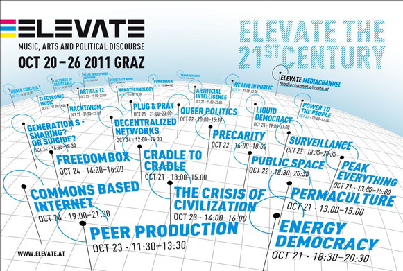 With an extensive program of discussions, workshops, lectures, and film presentations, Elevate Festival 2009 fostered a better understanding of serious world crises (in the areas of climate and energy, natural resources, nutrition, economy, politics and media) that are currently posing significant challenges to humanity. At this juncture, the focus was on examinations of alternative perspectives and analyses diverging from inadequate explanatory models, which are frequently distorted by political interests and dominated by mainstream media and public discourse.