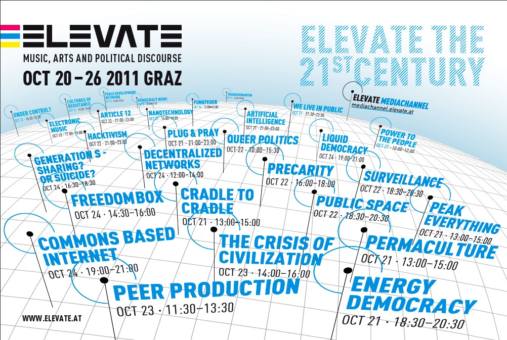 Unter dem Motto "Elevate Civil Society" diskutierten internationale Gäste wie Iara Lee, Béatrice Achaleke und Mike Bonanno of the Yes Men über einige der brisantesten Themen unserer Zeit. Via Live-Videostream waren Nnimmo Bassey, Bill McKibben und Rob Hopkins zugeschaltet. Im Mittelpunkt der Gespräche stand die Frage, wie jede(r) einzelne dazu beitragen kann, der Klima- und Wirtschaftskrise sowie den sozialen Ungleichheiten entgegenzuwirken. "Get Active!" lautete daher auch einer der zahlreichen Programmpunkte, der knapp 20 Initiativen und NGOs im Forum Stadtpark versammelte. Gleichzeitig präsentierte Elevate eine breite Palette elektronischer Musik, die zum Nachdenken und bewussten Zuhören anregte. Mit "Hörgerede" wurde erstmals auch ein Literaturprogramm geboten.