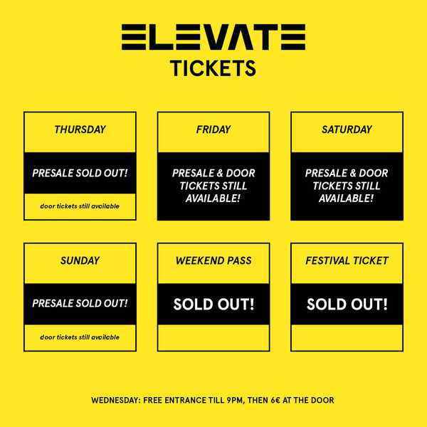 Elevate Festival Tickets können online mittels Paypal, Sofortüberweisung oder Kreditkarte gekauft werden. Die Tickets werden direkt bei der Bestellung generiert und per Email zugesandt. Diese bitte dann ausdrucken und an der Abendkassa gegen ein Elevate Armband eintauschen.