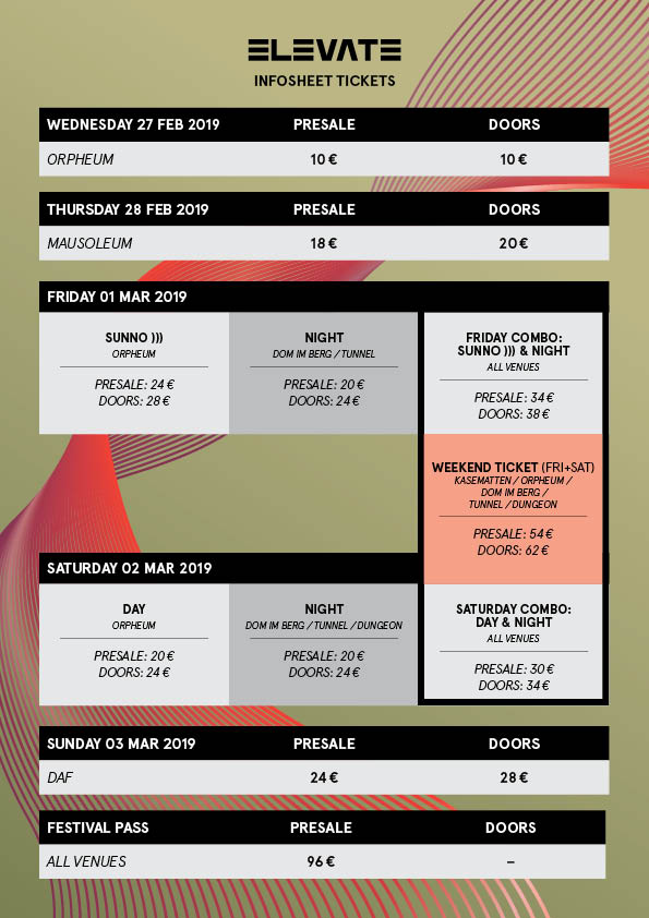 Vorverkaufsstellen: Blue Tomato Shop Graz, Murgasse 11, 8010 Graz und DUXRECORDS, Annenstraße 7, 8020 Graz (ausgenommen Eröffnungstickets. Diese sind nur online via ntry erhältlich oder direkt an der Abendkassa im Orpheum)
